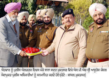 ਸ੍ਰੀ ਮੁਕਤਸਰ ਸਾਹਿਬ, (ਸੁਨੀਲ ਬਾਂਸਲ) -: ਇਥੋਂ ਦੇ ਕੋਟਕਪੂਰਾ ਰੋਡ ਸਥਿਤ ਥਾਨਾ ਸਦਰ ਵਿਖੇ ਪੁਲਿਸ ਵਿਭਾਗ ਵੱਲੋਂ ਪੁਲਿਸ ਐਲਡਰਜ਼ ਦਿਹਾੜਾ ਮਨਾਇਆ ਗਿਆ। ਇਸ ਮੌਕੇ ਸਮਾਰੋਹ ਸਮੇਂ ਸ੍ਰੀ ਆਸ਼ੂਤੋਸ਼ ਕੌਸ਼ਲ ਐਸ.ਪੀ.ਹੈਡਕੁਆਟਰ ਬਤੌਰ ਮੁੱਖ ਮਹਿਮਾਨ ਅਤੇ ਸ੍ਰੀ ਗੁਰਦੀਪ ਸਿੰਘ ਡੀ.ਐਸ.ਪੀ.ਵਿਸ਼ੇਸ਼ ਮਹਿਮਾਨ ਸ਼ਾਮਲ ਹੋਏ।  ਇਸ ਮੌਕੇ ਵੱਡੀ ਗਿਣਤੀ ਵਿੱਚ ਪੁਲਿਸ ਮੁਲਾਜ਼ਮ ਤੇ ਸ਼ਹਿਰੀ ਲੋਕ ਸ਼ਾਮਲ ਸਨ। ਸਮਾਰੋਹ ਦੌਰਾਨ ਬੁਲਾਰਿਆ ਨੇ ਮੌਜੂਦਗੀ ਨੂੰ ਐਲਡਰਜ਼ ਦਿਹਾੜੇ ਸੰਬੰਧੀ ਵਿਸਥਾਰ ਨਾਲ ਜਾਣਕਾਰੀ ਦਿੱਤੀ। ਇਸ ਮੌਕੇ ਪ੍ਰੀਤਮ ਸਿੰਘ ਇੰਸਪੈਕਟਰ, ਅਜੈਬ ਸਿੰਘ ਹਵਲਦਾਰ, ਸੱਜਣ ਸਿੰਘ ਹਵਲਦਾਰ, ਬਲਤੇਜ ਸਿੰਘ ਏ.ਐਸ.ਆਈ.ਅਤੇ ਸਾਹਿਬ ਸਿੰਘ ਸਿਪਾਹੀ ਆਦਿ ਸੇਵਾਮੁਕਤ ਅਧਿਕਾਰੀਆਂ ਨੂੰ ਮੁੱਖ ਮਹਿਮਾਨ ਵੱਲੋਂ ਸਨਮਾਨਿਤ ਕੀਤਾ ਗਿਆ ਅਤੇ ਉਨ੍ਹਾਂ ਵੱਲੋਂ ਨਿਭਾਈਆਂ ਗਈਆਂ ਸੇਵਾਵਾਂ ਦੀ ਪ੍ਰਸ਼ੰਸਾ ਕੀਤੀ। ਇਸ ਮੌਕੇ ਪੁਲਿਸ ਪੈਂਸ਼ਨਰਜ਼ ਐਸੋਸੀਏਸ਼ਨ ਵੱਲੋਂ ਪ੍ਰਧਾਨ ਬਾਜ ਸਿੰਘ ਨੇ ਬਾਕੀ ਮੈਂਬਰਾਂ ਨਾਲ ਮੁੱਖ ਮਹਿਮਾਨ ਨੂੰ ਮੰਗ ਪੱਤਰ ਦਿੱਤਾ ਜਿਸ ’ਤੇ ਮੁੱਖ ਮਹਿਮਾਨ ਸ੍ਰੀ ਕੌਸ਼ਲ ਨੇ ਐਸੋਸੀਏਸ਼ਨ ਦੀਆਂ ਮੁੱਖ ਮੰਗਾਂ ਦਾ ਮੌਕੇ ਤੇ ਹੀ ਨਿਪਟਾਰ ਕਰ ਦਿੱਤਾ ਤੇ ਬਾਕੀ ਰਹਿੰਦੀਆਂ ਮੰਗਾਂ ਨੂੰ ਵੀ ਜਲਦੀ ਲਾਗੂ ਕਰਵਾਉਣ ਦਾ ਭਰੋਸਾ ਦਿੱਤਾ। ਸਟੇਜ ਸਕੱਤਰ ਦੀ ਭੂਮਿਕਾ ਜਗਸੀਰ ਸਿੰਘ ਪੀ.ਆਰ.ਓ.ਨੇ ਅਦਾ ਕੀਤੀ।