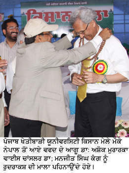 ਲੁਧਿਆਣਾ:- ਪੰਜਾਬ ਖੇਤੀਬਾੜੀ ਯੂਨੀਵਰਸਿਟੀ ਲੁਧਿਆਣਾ ਵੱਲੋਂ ਲਗਾਏ ਕਿਸਾਨ ਮੇਲੇ ਵਿੱਚ ਨੇਪਾਲ ਤੋਂ ਆਏ ਕਿਸਾਨਾਂ ਦੇ ਪ੍ਰਤੀਨਿਧ ਵਿਗਿਆਨੀ ਡਾ: ਅਸ਼ੋਕ ਮੁਰਾਰਕਾ ਨੇ ਵਾਈਸ ਚਾਂਸਲਰ ਡਾ: ਮਨਜੀਤ ਸਿੰਘ ਕੰਗ ਨੂੰ ਰੁਦਰਾਕਸ਼ ਦੇ ਪੰਜ ਬੂਟੇ ਭੇਂਟ ਕੀਤੇ। ਡਾ: ਮੁਰਾਰਕਾ ਨੇ ਡਾ: ਕੰਗ ਨੂੰ ਰੁਦਰਾਕਸ਼ ਦੀ ਇਕ ਮਾਲਾ ਅਤੇ ਸਨਮਾਨ ਚਿੰਨ੍ਹ ਭੇਂਟ ਕਰਦਿਆਂ ਦਾਅਵਤ ਦਿੱਤੀ ਕਿ ਉਹ ਨੇਪਾਲ ਦੀ ਖੇਤੀਬਾੜੀ ਨੂੰ ਅਗਵਾਈ ਦੇਣ ਲਈ ਯੂਨੀਵਰਸਿਟੀ ਦੇ ਵਿਗਿਆਨੀਆਂ ਅਤੇ ਅਗਾਂਹਵਧੂ ਕਿਸਾਨਾਂ ਦਾ ਇਕ ਵਫਦ ਭੇਜਣ ਤਾਂ ਜੋ ਗੁਆਂਢੀ ਦੇਸ਼ ਨੇਪਾਲ ਵੀ ਪੰਜਾਬੀ ਕਿਸਾਨਾਂ ਤੋਂ ਵਿਕਾਸ ਦਾ ਸਬਕ ਹਾਸਿਲ ਕਰ ਸਕੇ।