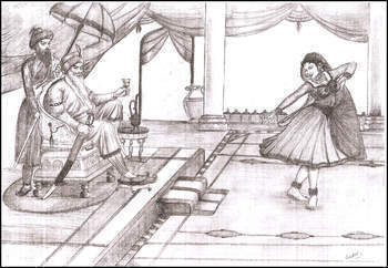 ਕਾਣੀ ਅੱਖ ਵਾਲਾ ਘੋੜ ਸਵਾਰ ਆਪਣੇ ਲੱਕ ਨਾਲ ਬੰਨ੍ਹੀ ਸਿੱਕਿਆਂ ਦੀ ਥੈਲੀ ਖੋਲ੍ਹਦਾ ਹੈ ਤੇ ਆਪਣੇ ਉਸੇ ਸਾਥੀ ਵੱਲ ਵਗਾਹ ਕੇ ਮਾਰਦਾ ਹੈ। ਉਸ ਦਾ ਸਾਥੀ ਜਿਉਂ ਹੀ ਥੈਲੀ ਬੋਚਦਾ ਹੈ ਤਾਂ ਕਾਣੀ ਅੱਖ ਵਾਲਾ ਘੋੜ ਸਵਾਰ ਹੁਕਮ ਕਰਦਾ ਹੈ, “ਗੁਲਾਬ ਸਿੰਘ, ਚੱਕ ਲਿਆਉ, ਅੱਜ ਤੋਂ ਇਹ ਸਿਰਫ ਲਾਹੌਰ ਦਰਬਾਰ ਵਿਚ ਹੀ ਮੁਜ਼ਰਾ ਕਰੇਗੀ।”