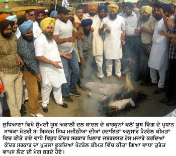 ਅੱਜ ਇਥੇ ਯੂਥ ਅਕਾਲੀ ਦਲ ਦੇ ਮੀਡੀਆ ਸਲਾਹਕਾਰ ਪ੍ਰੋ: ਸਰਚਾਂਦ ਸਿੰਘ ਰਾਹੀਂ ਜਾਰੀ ਇਕ ਬਿਆਨ ਵਿਚ ਸ਼੍ਰੋਮਣੀ ਯੂਥ ਅਕਾਲੀ ਦਲ ਦੇ ਪ੍ਰਧਾਨ ਸ ਬਿਕਰਮ ਸਿੰਘ ਮਜੀਠੀਆ ਨੇ ਦਸਿਆ ਕਿ ਪਿਛਲੇ ਇਕ ਸਾਲ ਦੌਰਾਨ ਸਰਕਾਰ ਨੇ ਪੈਟਰੋਲੀਅਮ ਪਦਾਰਥਾਂ ਦੀਆਂ ਕੀਮਤਾਂ 11 ਵਾਰ ਵਧਾਈਆਂ ਹਨ। ਉਹਨਾਂ ਕਿਹਾ ਕਿ ਕੱਚੇ ਤੇਲ ਦੀਆਂ ਕੀਮਤਾਂ ਘਟ ਰਹੀਆਂ ਹਨ ਪਰ ਭਾਰਤ ਵਿਚ ਕਿਸੇ ਨਾ ਕਿਸੇ ਬਹਾਨੇ ਤੇਲ ਕੀਮਤਾਂ ਵਧਾਈਆਂ ਜਾ ਰਹੀਆਂ ਹਨ। ਉਹਨਾਂ ਉਹਨਾਂ ਕਿਹਾ ਕਿ ਕਾਂਗਰਸ ਦੀ ਅਗਵਾਈ ਵਾਲੀ ਯੂ.ਪੀ.ਏ ਸਰਕਾਰ ਕਚੇ ਤੇਲ ਦੀਆਂ ਕੀਮਤਾਂ ਵਿਚ ਆਈ ਕਮੀ ਦਾ ਲਾਭ ਉਪਭੋਗਤਾਵਾਂ ਨੂੰ ਦੇਣ ਦੀ ਬਜਾਏ ਕਈ ਤਰਾਂ ਦੇ ਬਹਾਨੇ ਬਣਾ ਕੇ ਆਮ ਜਨਤਾ ਨੂੰ ਲੁੱਟ ਰਹੀ ਹੈ। ਉਹਨਾਂ ਕਿਹਾ ਕਿ ਸ਼੍ਰੋਮਣੀ ਅਕਾਲੀ ਦਲ ਪੈਟਰੋਲੀਅਮ ਪਦਾਰਥਾਂ ਦੀਆਂ ਕੀਮਤ ਤੈਅ ਕਰਨ ਅਤੇ ਪੂਰੀ ਪ੍ਰਣਾਲੀ ਵਿਚ ਪਾਰਦਰਸ਼ਤਾ ਲਿਆਉਣ ਲਈ ਸਰਬ ਪਾਰਟੀ ਕਮੇਟੀ ਗਠਿਤ ਕਰਨ ਦੀ ਮੰਗ ਕਰਦੀ ਹੈ ਪਰ ਕਾਂਗਰਸ ਦੀ ਅਗਵਾਈ ਵਾਲੀ ਯੂ.ਪੀ.ਏ ਸਰਕਾਰ ਬਹੁਰਾਸ਼ਟਰੀ ਕੰਪ੍ਯਨੀਆਂ ਨੂੰ ਲਾਭ ਪਹੁੰਚਾਉਣ ਲਈ ਅਜਿਹੇ ਪ੍ਰਸਤਾਵਾਂ ਤੋ ਪਾਸਾ ਵੱਟ ਰਹੀ ਹੈ। ਆਰਥਿਕ ਦੁਰਪ੍ਰਬੰਧ ਲਈ ਕਾਂਗਰਸ ਦੀ ਅਗਵਾਈ ਵਾਲੀ ਯੂ.ਪੀ.ਏ ਸਰਕਾਰ ਦੀ ਤਿੱਖੀ ਆਲੋਚਨਾ ਕਰਦੇ ਹੋਏ ਸ ਮਜੀਠੀਆ ਨੇ ਕਿਹਾ ਕਿ ਪ੍ਰਧਾਨ ਮੰਤਰੀ ਡਾ ਮਨਮੋਹਨ ਸਿੰਘ ਹਰ ਮਹੀਨੇ ਜਰੂਰੀ ਵਸਤਾਂ ਦੀਆਂ ਕੀਮਤਾਂ ਵਿਚ ਕਮੀ ਲਿਆਉਣ ਦਾ ਨਿਯਮਤ ਤੋਰ ਤੇ ਵਾਅਦਾ ਕਰਦੇ ਹਨ ਪਰ ਇਸ ਦੇ ਬਾਵਜੂਦ ਉਹ ਨੋਟ ਪਸਾਰੇ ਨੂੰ ਰੋਕਣ ਵਿਚ ਅਸਫਲ ਰਹੇ ਹਨ ਜੋ ਕਿ ਦਹਾਈ ਅੰਕ ਤੱਕ ਪਹੂੰਚ ਗਿਆ ਹੈ। ਉਹਨਾਂ ਕਿਹਾ ਕਿ ਉਦਯੋਗ ਅਤੇ ਵਪਾਰ ਪਹਿਲਾਂ ਹੀ ਆਰ ਬੀ ਆਈ ਵਲੋਂ ਨੋਟ ਪਸਾਰੇ ਨੂੰ ਨੱਥ ਪਾਉਣ ਦੇ ਨਾਂ ਹੇਠ ਵਿਆਜ ਦਰਾਂ ਵਿਚ 19 ਮਹੀਨਿਆਂ ਵਿਚ 13 ਵਾਰ ਵਾਧਾ ਕਰਕੇ ਛੋਟੇ ਅਤੇ ਦਰਮਿਆਨੇ ਉਦਯੋਗਾਂ ਨੂੰ ਬੁਰੀ ਤਬਾਹ ਕਰਨ ਤੇ ਤੁਲੀ ਹੋਈ ਹੈ। ਉਥੇ ਹੁਣ ਸਰਕਾਰ ਨੇ ਪੈਟਰੋਲ ਦੀ ਕੀਮਤ ਵਿਚ ਗੈਰ ਜਰੂਰੀ ਵਾਧੇ ਨਾਲ ਪੂਰੀ ਆਰਥਿਕਤਾ ਨੂੰ ਬਰੇਕ ਲਗਾਉਣ ਦੀ ਕੋਸ਼ਿਸ਼ ਕੀਤੀ ਹੈ।