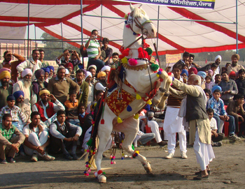 ਸ੍ਰੀ ਮੁਕਤਸਰ ਸਾਹਿਬ ਵਿਖੇ ਹੋ ਰਹੀ ਕੌਮੀ ਪਸ਼ੂਧਨ ਚੈਂਪੀਅਨਸ਼ਿਪ ਦੌਰਾਨ ਘੋੜੀਆਂ ਦੇ ਹੋ ਰਹੇ ਨਾਚ ਮੁਕਾਬਲਿਆਂ ਦੇ ਦ੍ਰਿਸ਼।(ਗੁਰਿੰਦਰਜੀਤ ਸਿੰਘ ਪੀਰਜੈਨ)