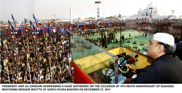 ਰਾਸ਼ਟਰਪਤੀ ਜਰਦਾਰੀ ਬੇਨਜ਼ੀਰ ਭੁੱਟੋ ਦੀ ਚੌਥੀ ਬਰਸੀ ਤੇ ਗੜ੍ਹੀ ਖੁਦਾ ਬਖਸ਼ ,ਚ ਜਨਤਾ ਨੂੰ ਸੰਬੋਧਨ ਕਰਦੇ ਹੋਏ