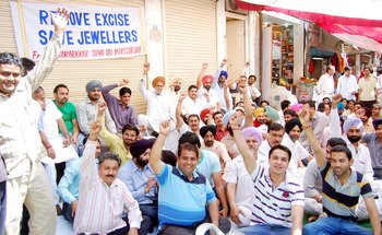 ਸਵਰਨਕਾਰ ਸੰਘ ਦੇ ਮੈਂਬਰ ਧਰਨੇ ਦੌਰਾਨ ਨਾਅਰੇਬਾਜ਼ੀ ਕਰਦੇ ਹੋਏ।(ਫੋਟੋ: ਬਾਂਸਲ)