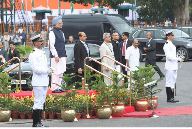 ਪ੍ਰਧਾਨਮੰਤਰੀ ਮਨਮੋਹਨ ਸਿੰਘ ਲਾਲ ਕਿਲ੍ਹੇ ‘ਚ ਸਲਾਮੀ ਲੈਂਦੇ ਹੋਏ