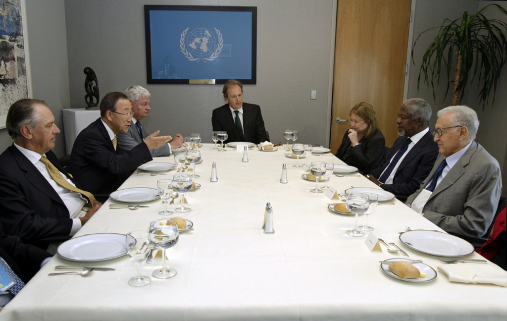 ਨਿਊਯਾਰਕ ‘ਚ ਮੂਨ ਵੱਲੋਂ ਦਿੱਤੇ ਗਏ ਡਿਨਰ ਦੌਰਾਨ ਕੋਫ਼ੀ ਅਨਾਨ ਅਤੇ ਲਖਦਰ ਬਰਾਹਿਮੀ