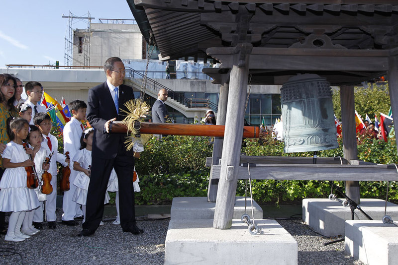 ਅੰਤਰਰਾਸ਼ਟਰੀ ਪੀਸ ਡੇ ਮੌਕੇ ਬਾਨ ਕੀ-ਮੂਨ ਪੀਸ ਘੰਟੀ ਵਜਾਉਂਦੇ ਹੋਏ