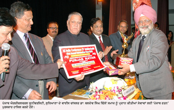 ਲੁਧਿਆਣਾ:- ਪੰਜਾਬ ਐਗਰੀਕਲਚਰਲ ਯੂਨੀਵਰਸਿਟੀ ਦੇ ਵਾਈਸ ਚਾਂਸਲਰ ਡਾ: ਬਲਦੇਵ ਸਿੰਘ ਢਿੱਲੋਂ ਨੂੰ ਸਮਾਜ ਨੂੰ ਪ੍ਰਦਾਨ ਕੀਤੀਆਂ ਸੇਵਾਵਾਂ ਲਈ ‘ਪੰਜਾਬ ਰਤਨ’ ਪੁਰਸਕਾਰ ਨਾਲ ਸਨਮਾਨਿਤ ਕੀਤਾ ਗਿਆ ਹੈ। ਇਹ ਸਨਮਾਨ ਚੰਡੀਗੜ੍ਹ ਦੇ ਸਰਕਾਰੀ ਮੈਡੀਕਲ ਕਾਲਜ ਵਿਖੇ ਆਯੋਜਿਤ ‘‘ਲੋਕਤੰਤਰ ਦੀਆਂ ਚੁਣੌਤੀਆਂ’’ ਵਿਸ਼ੇ ਨਾਲ ਸਬੰਧਿਤ ਹੋਈ ਕਾਨਫਰੰਸ ਵਿੱਚ ਦਿੱਤਾ ਗਿਆ। ਇਹ ਸਨਮਾਨ ਡਾ: ਢਿੱਲੋਂ ਨੂੰ ਭਾਰਤ ਦੇ ਇਲੈਕਸ਼ਨ ਕਮਿਸ਼ਨਰ ਸ਼੍ਰੀ ਐਚ ਐਸ ਬ੍ਰਹਮਾ ਵੱਲੋਂ ਪ੍ਰਦਾਨ ਕੀਤਾ ਗਿਆ ।