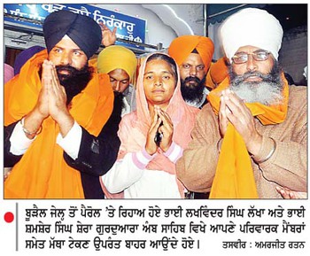 ਭਾਈ ਲਖਵਿੰਦਰ ਸਿੰਘ ਲੱਖਾ ਅਤੇ ਸ਼ਮਸ਼ੇਰ ਸਿੰਘ ਸ਼ੇਰਾ ਨੇ ਰਿਹਾਅ ਹੋਣ ਉਪਰੰਤ ਗੁਰੁਦੁਆਰਾ ਸ੍ਰੀ ਅੰਬ ਸਾਹਿਬ ਵਿਖੇ ਮੱਥਾ ਟੇਕਿਆ