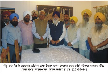 ਅੰਮ੍ਰਿਤਸਰ – ਜੰਮੂ-ਕਸ਼ਮੀਰ ਵਿੱਚ ਆਏ ਹੜ੍ਹਾਂ ਦੇ ਪਾਣੀ ਕਾਰਨ ਬੇਘਰ ਹੋਏ ਜੰਮੂ-ਕਸ਼ਮੀਰ ਦੇ ਸਿੱਖ ਪ੍ਰੀਵਾਰਾਂ ਨੂੰ ਆ ਰਹੀਆਂ ਭਾਰੀ ਮੁਸ਼ਕਲਾਂ ਦੇ ਹੱਲ ਲਈ ਸ਼੍ਰੋਮਣੀ ਗੁਰਦੁਆਰਾ ਪ੍ਰਬੰਧਕ ਕਮੇਟੀ ਦੇ ਪ੍ਰਧਾਨ ਜਥੇਦਾਰ ਅਵਤਾਰ ਸਿੰਘ ਨੇ ਗਵਰਨਰ ਹਾਊਸ ਸ੍ਰੀਨਗਰ ਵਿਖੇ ਜੰਮੂ-ਕਸ਼ਮੀਰ ਦੇ ਗਵਰਨਰ ਸ੍ਰੀ ਐਨ ਐਨ ਵੋਹਰਾ ਨਾਲ ਵਿਸ਼ੇਸ਼ ਤੌਰ ਤੇ ਮੁਲਾਕਾਤ ਕੀਤੀ। ਇਸ ਦੌਰਾਨ ਸ਼੍ਰੋਮਣੀ ਕਮੇਟੀ ਪ੍ਰਧਾਨ ਜਥੇਦਾਰ ਅਵਤਾਰ ਸਿੰਘ, ਸ੍ਰ: ਰੂਪ ਸਿੰਘ ਤੇ ਸ੍ਰ: ਸਤਬੀਰ ਸਿੰਘ ਸਕੱਤਰ, ਸ੍ਰ: ਦਿਲਜੀਤ ਸਿੰਘ ਵਧੀਕ ਸਕੱਤਰ, ਸ੍ਰ: ਰਜਿੰਦਰ ਸਿੰਘ ਰੂਬੀ, ਸ੍ਰ: ਗੁਰਜੀਤ ਸਿੰਘ ਦੱਤਾ ਪ੍ਰਧਾਨ ਗੁਰਦੁਆਰਾ ਕਮੇਟੀ ਬਡਗਾਮ, ਸ੍ਰੀ ਰਮੇਸ਼ ਯਾਦਵ ਸਮੇਤ ੧੦ ਮੈਂਬਰੀ ਵਫ਼ਦ ਸ਼ਾਮਲ ਹੋਇਆ। ਇਸ ਮੌਕੇ ਜਥੇਦਾਰ ਅਵਤਾਰ ਸਿੰਘ ਨੇ ਜੰਮੂ-ਕਸ਼ਮੀਰ ਦੇ ਗਵਰਨਰ ਸ੍ਰੀ ਨਰਿੰਦਰ ਨਾਥ ਵੋਹਰਾ ਨੂੰ ਹੜ੍ਹ ਪ੍ਰਭਾਵਿਤ ਸਿੱਖਾਂ ਦੇ ਇਲਾਕਿਆਂ ਤੋਂ ਜਾਣੂ ਕਰਵਾਉਂਦਿਆਂ ਸ਼ਹਿਰ ਦੀ ਸਾਫ਼ ਸਫ਼ਾਈ ਅਤੇ ਸਿੱਖ ਪ੍ਰੀਵਾਰਾਂ ਦੇ ਮੁੜ ਵਸੇਬੇ ਤਬਾਹ ਹੋ ਗਏ ਵਪਾਰਾਂ ਸਬੰਧੀ ਅਤੇ ਕੇਂਦਰ ਸਰਕਾਰ ਤੋਂ ਇਸ ਆਫ਼ਤ ਵਿੱਚ ਮਾਰੇ ਗਏ ਲੋਕਾਂ ਦੇ ਪ੍ਰੀਵਾਰਾਂ ਲਈ ਵਿੱਤੀ ਪੈਕਜ ਦੀ ਮੰਗ ਕੀਤੀ। ਇਸ ਮੌਕੇ ਗਵਰਨਰ ਸ੍ਰੀ ਐਨ ਐਨ ਵੋਹਰਾ ਨੇ ਜਥੇਦਾਰ ਅਵਤਾਰ ਸਿੰਘ ਤੇ ਉਨ੍ਹਾਂ ਦੇ ਸਾਥੀਆਂ ਨੂੰ ਗੰਭੀਰਤਾ ਨਾਲ ਸੁਣਿਆਂ ਤੇ ਇਨ੍ਹਾਂ ਦੇ ਮਸਲਿਆਂ ਦੇ ਸਰਲੀਕਰਨ ਕਰਵਾਉਣ ਦਾ ਭਰੋਸਾ ਦਿੱਤਾ। ਸ੍ਰੀ ਵੋਹਰਾ ਨੇ ਕਿਹਾ ਕਿ ਮੈਂ ਪੰਜਾਬ ਨਾਲ ਸਬੰਧਤ ਹਾਂ। ਪੰਜਾਬ ਦੇ ਲੋਕ ਬਹੁਤ ਹੀ ਖੁਸ਼ਦਿਲ ਤੇ ਰਹਿਮ ਵਾਲੇ ਹਨ। ਉਨ੍ਹਾਂ ਨੇ ਸ਼੍ਰੋਮਣੀ ਕਮੇਟੀ ਵੱਲੋਂ ਸ੍ਰੀਨਗਰ (ਜੰਮੂ-ਕਸ਼ਮੀਰ) ਵਿਖੇ ਕੀਤੇ ਜਾ ਰਹੇ ਰਾਹਤ ਕਾਰਜਾਂ ਦੀ ਪ੍ਰਸੰਸਾ ਕੀਤੀ ਹੈ ਤੇ ਕਿਹਾ ਕਿ ਸ਼੍ਰੋਮਣੀ ਕਮੇਟੀ ਹੀ ਅਜਿਹੀ ਸਿਰਮੌਰ ਸੰਸਥਾ ਹੈ ਜੋ ਅਜੇਹੀਆਂ ਆਫ਼ਤਾਂ ਮੌਕੇ ਪੂਰਨ ਸਹਿਯੋਗ ਕਰਦੀ ਹੈ। ਸ਼੍ਰੋਮਣੀ ਕਮੇਟੀ ਵਲੋਂ ਕੀਤੇ ਜਾ ਰਹੇ ਰਾਹਤ ਕਾਰਜ ਚੰਗੇ ਅਤੇ ਲੋਕ ਭਲਾਈ ਵਾਲੇ ਹਨ। ਸ੍ਰੀ ਵੋਹਰਾ ਨੇ ਕਿਹਾ ਕਿ ਮੇਰਾ ਪਿੰਡ ਅਟਾਰੀ ਦੇ ਨਜਦੀਕ ਵਨੀਏਂ ਕੇ ਹੈ, ਉਸ ਦੀ ਮਿੱਟੀ ਮੁੜ ਚੁੰਮਣ ਨੂੰ ਦਿਲ ਕਰਦਾ ਹੈ ਤੇ ਮੈਂ ਥੋੜ੍ਹੇ ਦਿਨਾਂ ਤੱਕ ਸਮਾਂ ਕੱਢ ਕੇ ਆਪਣੇ ਪਿੰਡ ਅਟਾਰੀ ਨਜ਼ਦੀਕ ਵਨੀਏਂ ਕੇ ਜਾਵਾਂਗਾ। ਇਸ ਮੌਕੇ ਗਵਰਨਰ ਸ੍ਰੀ ਵੋਹਰਾ ਨੂੰ ਯਾਦ ਪੱਤਰ ਦੇਣ ਉਪਰੰਤ ਪੱਤਰਕਾਰਾਂ ਨਾਲ ਗੱਲਬਾਤ ਕਰਦਿਆਂ ਜਥੇਦਾਰ ਅਵਤਾਰ ਸਿੰਘ ਪ੍ਰਧਾਨ ਸ਼੍ਰੋਮਣੀ ਕਮੇਟੀ ਨੇ ਕਿਹਾ ਕਿ ਸ਼੍ਰੋਮਣੀ ਕਮੇਟੀ ਨੇ ਜੰਮੂ-ਕਸ਼ਮੀਰ ਅੰਦਰ ਹਰ ਧਰਮ ਦੇ ਪ੍ਰੀਵਾਰਾਂ ਦੀ ਸਹਾਇਤਾ ਕਰਦਿਆਂ ਆਪਣੀ ਬਣਦੀ ਸਰਬੱਤ ਦੇ ਭਲੇ ਵਾਲੀ ਜਿੰਮੇਵਾਰੀ ਪੂਰੀ ਤਨਦੇਹੀ ਨਾਲ ਨਿਭਾਈ ਹੈ। ਸ਼੍ਰੋਮਣੀ ਕਮੇਟੀ ਵਲੋਂ ਕੀਤੇ ਜਾ ਰਹੇ ਰਾਹਤ ਕਾਰਜਾਂ ਵਿਚੋਂ ਰਾਹਤ ਮੁਸਲਮਾਨ, ਈਸਾਈ, ਹਿੰਦੂ ਹਰ ਧਰਮ ਦਾ ਵਿਅਕਤੀ ਲੈ ਰਿਹਾ ਹੈ ਤੇ ਕਿਸੇ ਨਾਲ ਕੋਈ ਵਿਤਕਰਾ ਨਹੀਂ ਕੀਤਾ ਜਾ ਰਿਹਾ ਉਨ੍ਹਾਂ ਕਿਹਾ ਕਿ ਸ਼੍ਰੋਮਣੀ ਕਮੇਟੀ ਵੱਲੋਂ ਰਾਹਤ ਕਾਰਜ ਉਦੋਂ ਤੀਕ ਜਾਰੀ ਰਹਿਣਗੇ ਜਿੰਨਾ ਚਿਰ ਕਸ਼ਮੀਰ ਦੇ ਲੋਕ ਆਪਣੇ ਘਰੋਂ ਘਰੀਂ ਨਹੀਂ ਚਲੇ ਜਾਂਦੇ। ਉਨ੍ਹਾਂ ਕਿਹਾ ਕਿ ਗੁਰੂ ਕਾ ਲੰਗਰ ਗੁਰਦੁਆਰਾ ਸ਼ਹੀਦ ਬੁੰਗਾ ਸ੍ਰੀਨਗਰ ਵਿਖੇ ਨਿਰੰਤਰ ਜਾਰੀ ਰਹੇਗਾ ਅਤੇ ਮੈਡੀਕਲ ਟੀਮਾਂ ਆਪਣੀਆਂ ਸੇਵਾਵਾਂ ਲਗਾਤਾਰ ਜਾਰੀ ਰੱਖਣਗੀਆਂ। ਸ਼੍ਰੋਮਣੀ ਕਮੇਟੀ ਕਸ਼ਮੀਰੀ ਭਾਈਚਾਰੇ ਨਾਲ ਮੋਢਾ ਦੇ ਕੇ ਖੜ੍ਹੀ ਹੈ।
