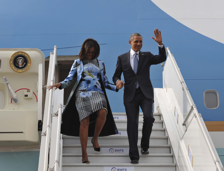ਓਬਾਮਾ ਤੇ ਮਿਸ਼ੇਲ ਪਾਲਮ ਏਅਰਪੋਰਟ ਤੇ ਆਉਂਦੇ ਹੋਏ
