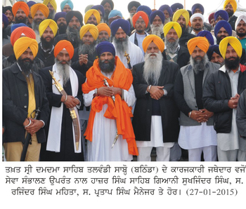 ਤਲਵੰਡੀ ਸਾਬ੍ਹੋ – ਸ਼੍ਰੋਮਣੀ ਗੁਰਦੁਆਰਾ ਪ੍ਰਬੰਧਕ ਕਮੇਟੀ ਵੱਲੋਂ 17 ਜਨਵਰੀ 2015 ਨੂੰ ਗੁਰਦੁਆਰਾ ਸ੍ਰੀ ਫਤਹਿਗੜ੍ਹ ਸਾਹਿਬ ਵਿਖੇ ਜਥੇਦਾਰ ਅਵਤਾਰ ਸਿੰਘ ਪ੍ਰਧਾਨ ਸ਼੍ਰੋਮਣੀ ਗੁਰਦੁਆਰਾ ਪ੍ਰਬੰਧਕ ਕਮੇਟੀ ਦੀ ਅਗਵਾਈ ਵਿੱਚ ਅੰਤ੍ਰਿੰਗ ਕਮੇਟੀ ਦੀ ਇਕੱਤਰਤਾ ਦੌਰਾਨ ਅਹਿਮ ਫੈਸਲਾ ਕਰਕੇ ਤਖ਼ਤ ਸ੍ਰੀ ਦਮਦਮਾ ਸਾਹਿਬ ਤਲਵੰਡੀ ਸਾਬ੍ਹੋ (ਬਠਿੰਡਾ) ਦਾ ਕਾਰਜਕਾਰੀ ਜਥੇਦਾਰ ਸਿੰਘ ਸਾਹਿਬ ਗਿਆਨੀ ਗੁਰਮੁਖ ਸਿੰਘ ਹੈਡ ਗ੍ਰੰਥੀ ਸ੍ਰੀ ਅਕਾਲ ਤਖ਼ਤ ਸਾਹਿਬ ਨੂੰ ਥਾਪਿਆ ਗਿਆ ਸੀ। ਸਿੰਘ ਸਾਹਿਬ ਗਿਆਨੀ ਗੁਰਮੁਖ ਸਿੰਘ ਨੇ ਜੈਕਾਰਿਆਂ ਦੀ ਗੂੰਜ ਵਿੱਚ ਤਖ਼ਤ ਸ੍ਰੀ ਦਮਦਮਾ ਸਾਹਿਬ ਦੇ ਕਾਰਜਕਾਰੀ ਜਥੇਦਾਰ ਵਜੋਂ ਅੱਜ ਆਪਣਾ ਅਹੁੱਦਾ ਸੰਭਾਲ ਲਿਆ।