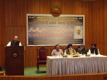 ਲਾਹੌਰ, (ਗੁਰੂ ਜੋਗਾ ਸਿੰਘ)- ਉੱਪ-ਮਹਾਂਦੀਂਪ ਦੀ ਅਜ਼ਾਦੀ ਦੇ ਮਹਾਨ ਪਾਤਰ ਸ੍ਰ. ਭਗਤ ਸਿੰਘ ਸ਼ਹੀਦ ਨੂੰ ਬਰਤਾਨਵੀ ਸਾਮਰਾਜ ਨੇ ੨੩ ਮਾਰਚ ੧੯੩੧ਈ ਨੂੰ ਫਾਸੀ ਚੜ੍ਹਾ ਕੇ ਅਮਰ ਕਰ ਦਿੱਤਾ।ਹਰ ਸਾਲ ਵਾਂਗੂੰ ਇਸ ਸਾਲ ਵੀ ਪੰਜਾਬੀ ਭਾਸ਼ਾ, ਸਾਹਿਤ ਅਤੇ ਸਭਿਆਚਾਰ ਦੀ ਪ੍ਰਫੁਲਤਾ ਦੇ ਲਈ ਯਤਨਸ਼ੀਲ ਸੰਸਥਾ ਦਿਆਲ ਸਿੰਘ ਰਿਸਰਚ ਐਂਡ ਕਲਚਰਲ ਫ਼ੋਰਮ ਵੱਲੋਂ ਭਗਤ ਸਿੰਘ ਸ਼ਹੀਦ ਦੇ ਹਵਾਲੇ ਨਾਲ ਦਿਆਲ ਸਿੰਘ ਆਡਿਟੋਰੀਅਲ ਵਿਚ ਇਕ ਸੈਮੀਨਾਰ “ਉੱਪ-ਮਹਾਂਦੀਪ ਦੀ ਅਜ਼ਾਦੀ ਲਹਿਰ ਅਤੇ ਸ੍ਰ. ਭਗਤ ਸਿੰਘ ਸ਼ਹੀਦ” ਦਾ ਪ੍ਰਬੰਧ ਕੀਤਾ ਗਿਆ।ਇਸ ਸੈਮੀਨਾਰ ਵਿਚ ਪਾਕਿਸਤਾਨ ਵਿਚ ਵੱਸਣ ਵਾਲੇ ਸਿੱਖ ਭਾਈਚਾਰੇ ਦੀ ਇਕ ਵੱਡੀ ਗਿਣਤੀ ਨੇ ਹਾਜ਼ਰੀ ਭਰੀ।ਸੈਮੀਨਾਰ ਦੇ ਮੁੱਖ ਪ੍ਰੋਹਣੇ ਸ੍ਰ. ਸ਼ਾਮ ਸਿੰਘ ਪ੍ਰਧਾਨ ਪਾਕਿਸਤਾਨ ਸਿੱਖ ਗੁਰਦੁਆਰਾ ਪ੍ਰਬੰਧਕ ਕਮੇਟੀ ਸਨ।