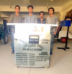 ਗੁਲਜ਼ਾਰ ਗਰੁੱਪ ਆਫ਼ ਇੰਸੀਟਿਚਿਊਸ, ਖੰਨਾ ਲੁਧਿਆਣਾ ਦੇ ਸੱਤ ਵਿਦਿਆਰਥੀਆਂ ਨੇ ਸੂਰਜੀ ਊਰਜਾ ਰਹੀ ਚੱਲ ਕੇ ਠੰਢੀਆਂ ਹਵਾਵਾਂ ਦੇਣ ਵਾਲਾ ਏ ਸੀ ਤਿਆਰ ਕੀਤਾ ਹੈ। ਮਕੈਨੀਕਲ ਅਤੇ ਸਿਵਲ ਇੰਜੀਨੀਅਰਿੰਗ ਵਿਭਾਗ ਦੇ ਪ੍ਰਿੰਸ ਰਾਜਪਾਲ, ਪ੍ਰਿਨੇ ਚੌਪੜਾ, ਹਰਿੰਦਰ ਸਿੰਘ, ਮਨਿੰਦਰ ਸਿੰਘ, ਦੀਪਇੰਦਰ ਸਿੰਘ, ਖੁਸ਼ਕਰਨ ਸਿੰਘ ਅਤੇ ਹਰਜੋਤ ਸਿੰਘ ਨਾਮਕ ਵਿਦਿਆਰਥੀਆਂ ਨੇ ਇਹ ਨਿਵੇਕਲਾ ਉਪਰਾਲਾ ਕਰਦੇ ਹੋਏ ਸਿਰਫ਼ 40 ਹਜ਼ਾਰ ਦੀ ਕੀਮਤ ਵਾਲਾ ਸੋਲਰ ਏ ਸੀ ਤਿਆਰ ਕੀਤਾ ਹੈ। ਇਸ ਸਬੰਧੀ ਇਸ ਏ ਸੀ ਨੂੰ ਤਿਆਰ ਕਰਨ ਵਾਲੇ ਪ੍ਰਿੰਸ ਰਾਜਪਾਲ ਨੇ ਜਾਣਕਾਰੀ ਦਿੰਦੇ ਹੋਏ ਦੱਸਿਆਂ ਕਿ ਸੂਰਜੀ ਊਰਜਾ ਦੇ ਸੈ¤ਲਾਂ ਨਾਲ ਬੈਟਰੀਆਂ ਨੂੰ ਇਕ ਵਾਰ ਚਾਰਜ ਕਰਕੇ ਇਹ ਏ ਸੀ ਪੰਜ ਤੋਂ ਸੱਤ ਘੰਟੇ ਤੱਕ ਚਲ ਸਕਦਾ ਹੈ।ਹਰਜਿੰਦਰ ਸਿੰਘ ਨੇ ਇਸ ਏ ਸੀ ਦੀ ਬਣਤਰ ਤੇ ਚਾਨਣਾ ਪਉਦੇ ਹੋਏ ਕਿਹਾ ਕਿ .75 ਟਨ ਦਾ ਇਸ ਏ ਸੀ ਵਿਚ ਇਕ ਹਾਰਸ ਪਾਵਰ ਦੀ ਮੋਟਰ ਲੱਗੀ ਹੈ । ਸੋਲਰ ਪੈਨਲਾਂ ਰਾਹੀਂ 65 ਐਪੀਅਰ ਦੇ ਕਰੰਟ ਰਾਹੀਂ ਇਹ 24 ਵੋਲਟ ਦੇ ਕਰੰਟ ਰਾਹੀਂ ਬੈਟਰੀਆਂ ਚਾਰਜ ਹੁੰਦੀਆਂ ਹਨ। ਇਸ ਤਰਾਂ ਇਹ ਏ ਸੀ ਜਿੱਥੇ ਦਿਨ ਵਿਚ ਲਗਾਤਾਰ ਚਾਰਜ ਹੁੰਦਾ ਰਹਿਣ ਸਦਕਾ ਪੂਰਾ ਦਿਨ ਚੱਲ ਸਕਦਾ ਹੈ ਉ¤ਥੇ ਹੀ ਰਾਜ ਵਿਚ ਪੰਜ ਤੋਂ ਸੱਤ ਘੰਟੇ ਆਰਾਮ ਨਾਲ ਚੱਲ ਸਕਦਾ ਹੈ। ਇਸ ਤਰਾਂ ਇਕ ਮਹੀਨੇ ਵਿਚ ਔਸਤਨ 10 ਹਜ਼ਾਰ ਰੁਪਏ ਤੱਕ ਦੀ ਬਿਜਲੀ ਬਚਾਈ ਜਾ ਸਕਦੀ ਹੈ।
