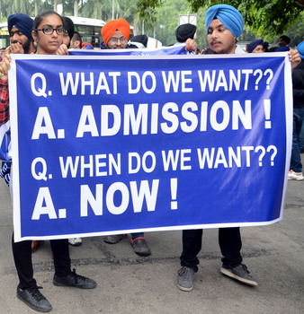 ਨਵੀਂ ਦਿੱਲੀ : ਦਿੱਲੀ ਸਿੱਖ ਗੁਰਦੁਆਰਾ ਪ੍ਰਬੰਧਕ ਕਮੇਟੀ ਦੇ 2 ਤਕਨੀਕੀ ਅਦਾਰਿਆਂ ਵਿਚ ਇਸ ਸਾਲ ਦੇ ਦਾਖਿਲੇ ਤੇ ਲਗੀ ਰੋਕ ਦੇ ਖਿਲਾਫ਼ ਅੱਜ ਸਿੱਖ ਭਾਈਚਾਰੇ ਦੇ ਲੋਕਾਂ ਨੇ ਕੇਂਦਰੀ ਮਨੁੱਖੀ ਸਰੋਤ ਵਿਕਾਸ ਮੰਤਰੀ ਪ੍ਰਕਾਸ਼ ਜਾਵੜੇਕਰ ਦੀ ਕੋਠੀ ਦੇ ਬਾਹਰ ਜਬਰਦਸ਼ਤ ਰੋਸ਼ ਪ੍ਰਦਰਸ਼ਨ ਕੀਤਾ। ਪ੍ਰਦਰਸ਼ਨ ਦੀ ਅਗਵਾਈ ਕਮੇਟੀ ਪ੍ਰਧਾਨ ਮਨਜੀਤ ਸਿੰਘ ਜੀ।ਕੇ। ਨੇ ਕੀਤੀ। ਪ੍ਰਦਰਸ਼ਨਕਾਰੀ ਨੇ ਕੇਂਦਰ ਸਰਕਾਰ ਦੀ ਘਟਗਿਣਤੀ ਕੌਮਾਂ ਵਿਰੋਧੀ ਨੀਤੀਆਂ ਦਾ ਹਵਾਲਾ ਦਿੰਦੀਆਂ ਤਖਤੀਆਂ ਹੱਥਾਂ ਵਿਚ ਫੜੀਆਂ ਸਨ। ਇਹਨਾਂ ਤਖਤੀਆਂ ਦੇ ਰਾਹੀਂ ਸਿੱਖ ਅਦਾਰਿਆਂ ਨੂੰ ਫਿਰਕੂ ਚਸ਼ਮੇ ਦੇ ਨਾਲ ਨਾ ਵੇਖਣ ਦੀ ਅਪੀਲ ਕੀਤੀ ਜਾ ਰਹੀ ਸੀ।