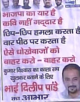 ਇਸ ਪੋਸਟਰ ਵਿੱਚ ਕੁਮਾਰ ਵਿਸ਼ਵਾਸ਼ ਨੂੰ ਭਾਜਪਾ ਦਾ ਦੋਸਤ ਅਤੇ ਪਾਰਟੀ ਦਾ ਗਦਾਰ ਦੱਸਿਆ ਗਿਆ ਹੈ। ਪੋਸਟਰ ਵਿੱਚ ਕੁਮਾਰ ਨੂੰ ਪਾਰਟੀ ਤੋਂ ਬਾਹਰ ਕੱਢਣ ਦੀ ਵੀ ਗੱਲ ਕੀਤੀ ਗਈ ਹੈ। ਇਸ ਬਾਰੇ ਇੱਕ ਗੱਲ ਤਾਂ ਤੈਅ ਹੈ ਕਿ ਆਮ ਆਦਮੀ ਪਾਰਟੀ ਦੇ ਅੰਦਰ ਸੱਭ ਕੁਝ ਠੀਕ ਨਹੀਂ ਚੱਲ ਰਿਹਾ, ‘ਦਾਲ ਵਿੱ ਕੁਝ ਤਾਂ ਕਾਲਾ ਹੈ’। ਪਾਰਟੀ ਦਫ਼ਤਰ ਦੇ ਬਾਹਰ ਜੋ ਪੋਸਟਰ ਲਗਾਏ ਗਏ ਹਨ, ਉਨ੍ਹਾਂ ਤੇ ਲਿਖਿਆ ਹੈ, ‘ਭਾਜਪਾ ਦਾ ਯਾਰ ਹ ਕਵੀ ਨਹੀਂ ਗਦਾਰ ਹੈ। ਛਿਪ ਕੇ ਹਮਲਾ ਕਰਤਾ ਹੈ, ਵਾਰ ਪੀਠ ਪੇ ਕਰਤਾ ਹੈ। ਐਸੇ ਧੋਖੇਬਾਜ਼ਾਂ ਨੂੰ ਬਾਹਰ ਕਰੋ….ਬਾਹਰ ਕਰੋ।’ ਭਾਂਵੇ ਅਜੇ ਤੱਕ ਇਨ੍ਹਾਂ ਪੋਸਟਰਾਂ ਸਬੰਧੀ ਇਹ ਸਪੱਸ਼ਟ ਨਹੀਂ ਹੋਇਆ ਕਿ ਇਹ ਕਿਸ ਨੇ ਲਗਾਏ ਹਨ। ਇਸ ਬਾਰੇ ਆਪ ਨੇਤਾਵਾਂ ਦਾ ਵੀ ਕੋਈ ਬਿਆਨ ਨਹੀਂ ਆਇਆ।