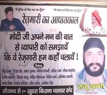 ਹੋਰਡਿੰਗ ਵਿੱਚ ਦੂਸਰੇ ਪਾਸੇ ਨਰੇਂਦਰ ਮੋਦੀ ਦੀ ਤਸਵੀਰ ਲਗੀ ਹੈ ਤੇ ਉਸ ਉਪਰ ਲਿਖਿਆ ਹੋਇਆ ਹੈ, ‘ਮੈਂ ਵਪਾਰ ਨੂੰ ਮਿਟਾ ਕੇ ਹੀ ਦਮ ਲਵਾਂਗਾ।’ ਪੁਲਿਸ ਨੇ ਉਸੇ ਦਿਨ ਇਸ ਮਾਮਲੇ ਵਿੱਚ ਐਫ਼ਆਈਆਰ ਦਰਜ਼ ਕਰ ਲਈ ਸੀ। ਪੁਲਿਸ ਹੁਣ ਪੋਸਟਰ ਲਗਾਉਣ ਵਾਲੇ ਵਪਾਰੀਆਂ ਨੂੰ ਪਕੜ ਰਹੀ ਹੈ।