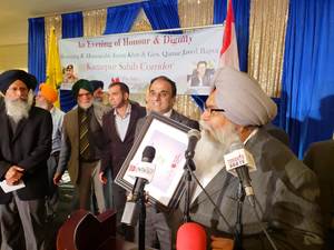 ਟਰਾਂਟੋ, (ਕੈਨੇਡਾ) – ਲੰਘੇ ਹਫਤੇ 21 ਦਸੰਬਰ ਦਿਨ ਸੁਕਰਵਾਰ ਸਾ਼ਮ ਨੂੰ ਬਰੈਂਪਟਨ ਵਿਖੇ ਕੀਤੇ ਗਏ ਪ੍ਰਭਾਵਸ਼ਾਲੀ ਸਮਾਗਮ ਵਿੱਚ ਸ੍ਰੀ ਕਾਰਤਾਰਪੁਰ ਸਾਹਿਬ ਦਾ ਲਾਂਘਾ ਖੋਲਣ ਦੀ ਖੁਸ਼ੀ ਵਿੱਚ ਕਨੇਡੀਅਨ ਸਿੱਖ ਸੰਗਤ ਤਰਫੋਂ ਵੱਖ ਵੱਖ ਸੰਸਥਾਵਾਂ ਦੇ ਸਹਿਯੋਗ ਨਾਲ ਪ੍ਰਧਾਨ ਮੰਤਰੀ ਇਮਰਾਨ ਖਾਨ ਅਤੇ ਫੌਜ ਮੁਖੀ ਜਾਵੇਦ ਬਾਜਵਾ ਦਾ ਗੋਲਡ ਮੈਡਲ ਨਾਲ ਸਨਮਾਨ ਕੀਤਾ ਗਿਆ। ਇਸ ਮੌਕੇ ਪਾਕਿਸਤਾਨ ਦੇ ਟਰਾਂਟੋ ਸਥਿਤ ਕਾਂਸਲੇਟ ਜਨਰਲ ਆਫ ਪਾਕਿਸਤਾਨ ਇਮਰਾਨ ਅਹਿਮਦ ਸਦੀਕੀ ਨੇ ਇਹ ਗੋਲਡ ਮੈਡਲ ਸਰਕਾਰ ਦੀ ਤਰਫੋਂ ਹਾਸਿਲ ਕੀਤੇ।