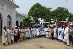ਹੜ੍ਹ ਪ੍ਰਭਾਵਿਤ ਪਿੰਡਾਂ ਲਈ ਲੋੜੀਦੀ ਰਾਹਤ ਸਮਗਰੀ ਦੀ ਵੱਡੀ ਖੇਪ ਨੂੰ ਰਵਾਨਾ ਕਰਦੇ ਹੋਏ ਸੰਤ ਗਿਆਨੀ ਹਰਨਾਮ ਸਿੰਘ ਖਾਲਸਾ ਤੇ ਹੋਰ।