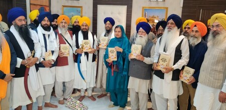 ਅੰਮ੍ਰਿਤਸਰ – ਸ੍ਰੀ ਅਕਾਲ ਤਖ਼ਤ ਸਾਹਿਬ ਦੇ ਸਕੱਤਰੇਤ ਵਿਖੇ ਜਥੇਦਾਰ ਗਿਆਨੀ ਹਰਪ੍ਰੀਤ ਸਿੰਘ, ਅਕਾਲੀ ਦਲ ਦੇ ਪ੍ਰਧਾਨ ਤੇ ਸਾਬਕਾ ਉਪ ਮੁੱਖ ਮੰਤਰੀ ਸ੍ਰ ਸੁਖਬੀਰ ਸਿੰਘ ਬਾਦਲ ਅਤੇ ਸ਼੍ਰੋਮਣੀ ਕਮੇਟੀ ਦੇ ਪ੍ਰਧਾਨ ਭਾਈ ਗੋਬਿੰਦ ਸਿੰਘ ਲੌਂਗੋਵਾਲ ਵੱਲੋਂ ਸਿੱਖ ਪੰਥ ਦੇ ਪ੍ਰੌਢ ਵਿਦਵਾਨ ਤੇ ਚਿੰਤਕ ਸ੍ਰ: ਗੁਰਚਰਨਜੀਤ ਸਿੰਘ ਲਾਂਬਾ ਵੱਲੋਂ ਰਚਿਤ ਪੁਸਤਕ ‘‘ਸਾਖੀ ਸਿੱਖ ਰਹਿਤ ਮਰਯਾਦਾ ਜੀ ਕੀ‘‘ ਨੂੰ ਸੰਗਤ ਅਰਪਿਤ ਕੀਤੀ ਗਈ। ਇਸ ਮੌਕੇ ਤਖ਼ਤ ਸ੍ਰੀ ਪਟਨਾ ਸਾਹਿਬ ਦੇ ਜਥੇਦਾਰ ਗਿਆਨੀ ਰਣਜੀਤ ਸਿੰਘ ਗੌਰੇ ਮਸਕੀਨ, ਤਖ਼ਤ ਸ੍ਰੀ ਕੇਸਗੜ੍ਹ ਸਾਹਿਬ ਦੇ ਜਥੇਦਾਰ ਗਿਆਨੀ ਰਘਬੀਰ ਸਿੰਘ, ਦਿੱਲੀ ਕਮੇਟੀ ਦੇ ਪ੍ਰਧਾਨ ਮਨਜਿੰਦਰ ਸਿੰਘ ਸਿਰਸਾ, ਪਟਨਾ ਸਾਹਿਬ ਕਮੇਟੀ ਦੇ ਪ੍ਰਧਾਨ ਸ੍ਰ ਅਵਤਾਰ ਸਿੰਘ ਹਿਤ, ਸ਼੍ਰੋਮਣੀ ਦੇ ਸਾਬਕਾ ਪ੍ਰਧਾਨ ਪ੍ਰੋ: ਕਿਰਪਾਲ ਸਿੰਘ ਬਡੂੰਗਰ, ਸ਼੍ਰੋਮਣੀ ਕਮੇਟੀ ਦੇ ਧਰਮ ਪ੍ਰਚਾਰ ਕਮੇਟੀ ਮੈਂਬਰ ਭਾਈ ਅਜੈਬ ਸਿੰਘ ਅਭਿਆਸੀ, ਸ਼੍ਰੋਮਣੀ ਕਮੇਟੀ ਮੈਂਬਰ ਬੀਬੀ ਕਿਰਨਜੋਤ ਕੌਰ, ਜਥੇ: ਗੁਰਮੀਤ ਸਿੰਘ ਬੂਹ, ਐਡਵੋਕੇਟ ਭਗਵੰਤ ਸਿੰਘ ਸਿਆਲਕਾ, ਸਿੱਖ ਚਿੰਤਕ ਡਾ: ਇੰਦਰਜੀਤ ਸਿੰਘ ਗੋਗੋਆਣੀ, ਡਾ: ਅਮਰਜੀਤ ਸਿੰਘ, ਭਾਈ ਨਵਤੇਜ ਸਿੰਘ ਕਥਾਵਾਚਕ, ਭਾਈ ਭਵਨ ਸਿੰਘ ਸਿੱਧੂ, ਬਾਬਾ ਜੰਗ ਸਿੰਘ ਅਤੇ ਪ੍ਰੋ: ਸਰਚਾਂਦ ਸਿੰਘ ਵੀ ਮੌਜੂਦ ਸਨ।