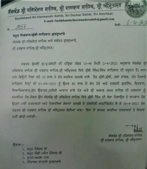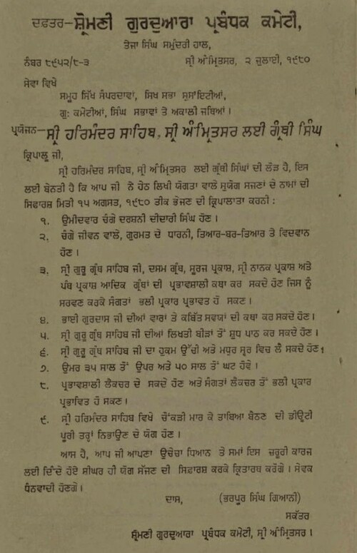 ਸ੍ਰੀ ਹਰਿਮੰਦਰ ਸਾਹਿਬ ਦੇ ਗ੍ਰੰਥੀ ਸਿੰਘਾਂ ਦੀ ਕੌਮ ’ਚ ਅਹਿਮੀਅਤ ਨੂੰ ਜਾਣਦਿਆਂ ਸ਼੍ਰੋਮਣੀ ਕਮੇਟੀ ਵੱਲੋਂ ਸ੍ਰੀ ਦਰਬਾਰ ਸਾਹਿਬ ਲਈ ਨਵੇਂ ਗ੍ਰੰਥੀ ਸਿੰਘਾਂ ਦੀ ਨਿਯੁਕਤੀ ਲਈ ਸਮੂਹ ਸਿੱਖ ਸੰਪਰਦਾਵਾਂ, ਸਿੱਖ ਸਭਾ ਸੁਸਾਇਟੀਆਂ, ਗੁ: ਕਮੇਟੀਆਂ ਸਿੰਘ ਸਭਾਵਾਂ ਅਤੇ ਅਕਾਲੀ ਜਥਿਆਂ ਤੋਂ ਰਾਏ ਅਤੇ ਸਿਫ਼ਾਰਸ਼ਾਂ ਮੰਗੀਆਂ ਜਾਂਦੀਆਂ ਰਹੀਆਂ। ਇੱਥੇ ਜੁਲਾਈ, 1980 ਦੌਰਾਨ ਸ਼੍ਰੋਮਣੀ ਕਮੇਟੀ ਦੇ ਸਕੱਤਰ ਗਿਆਨੀ ਭਰਪੂਰ ਸਿੰਘ ਜੀ ਵੱਲੋਂ ਨਵੇਂ ਗ੍ਰੰਥੀ ਸਿੰਘਾਂ ਦੀ ਚੋਣ ਲਈ ਸਿੱਖ ਸੰਪਰਦਾਵਾਂ – ਜਥੇਬੰਦੀਆਂ ਨੂੰ ਭੇਜੀ ਗਈ ਚਿੱਠੀ ਦਾ ਹਵਾਲਾ ਦੇਣਾ ਕੁਥਾਂ ਨਹੀਂ ਹੋਵੇਗਾ। ਉਹ ਲਿਖਦੇ ਹਨ ਕਿ ਸ੍ਰੀ ਹਰਿਮੰਦਰ ਸਾਹਿਬ ਲਈ ਗ੍ਰੰਥੀ ਸਿੰਘਾਂ ਦੀ ਲੋੜ ਹੈ, ਆਪ ਜੀ ਆਪਣਾ ਉਚੇਚਾ ਧਿਆਨ ਅਤੇ ਸਮਾਂ ਇਸ ਜ਼ਰੂਰੀ ਕਾਰਜ ਲਈ ਦਿੰਦੇ ਹੋਏ ਸ਼ੀਘਰ ਹੀ ਹੇਠ ਲਿਖੇ ਯੋਗਤਾ ਵਾਲੇ ਸੁਯੋਗ ਸੱਜਣਾਂ ਦੇ ਨਾਮਾਂ ਦੀ ਸਿਫ਼ਾਰਸ਼ ਭੇਜਣ ਦੀ ਕਿਰਪਾਲਤਾ ਕਰਨੀ। ਉਮੀਦਵਾਰ ਦਰਸ਼ਨੀ ਦੀਦਾਰੀ ਹੋਣ। ਚੰਗੇ ਜੀਵਨ ਵਾਲੇ ਗੁਰਮਤਿ ਦੇ ਧਾਰਨੀ , ਤਿਆਰ ਭਰ ਤਿਆਰ ਤੇ ਵਿਦਵਾਨ ਹੋਣ। ਸ੍ਰੀ ਗੁਰੂ ਗ੍ਰੰਥ ਸਾਹਿਬ ਜੀ, ਦਸਮ ਗ੍ਰੰਥ, ਸੂਰਜ ਪ੍ਰਕਾਸ਼, ਸ੍ਰੀ ਨਾਨਕ ਪ੍ਰਕਾਸ਼ ਅਤੇ ਪੰਥ ਪ੍ਰਕਾਸ਼ ਆਦਿ ਗ੍ਰੰਥਾਂ ਦੀ ਪ੍ਰਭਾਵਸ਼ਾਲੀ ਕਥਾ ਕਰ ਸਕਦੇ ਹੋਣ ਜਿਸ ਨੂੰ ਸਰਵਣ ਕਰਕੇ ਸੰਗਤਾਂ ਭਲੀ ਪ੍ਰਕਾਰ ਪ੍ਰਭਾਵਿਤ ਹੋ ਸਕਣ। ਭਾਈ ਗੁਰਦਾਸ ਜੀ ਦੀਆਂ ਵਾਰਾਂ ਤੇ ਕਬਿੱਤ ਸਵੱਯਾਂ ਦੀ ਕਥਾ ਕਰ ਸਕਦੇ ਹੋਣ। ਸ੍ਰੀ ਗੁਰੂ ਗ੍ਰੰਥ ਸਾਹਿਬ ਜੀ ਦੀਆਂ ਲਿਖਤੀ ਬੀੜਾਂ ਤੋਂ ਸੁੱਧ ਪਾਠ ਕਰ ਸਕਦੇ ਹੋਣ। ਹੁਕਮਨਾਮਾ ਉੱਚੀ ਅਤੇ ਮਧੁਰ ਸੁਰ ’ਚ ਲੈ ਸਕਦੇ ਹੋਣ। ਉਮਰ 35 ਤੋਂ ਉੱਪਰ ਤੇ 50 ਤੋਂ ਘਟ ਹੋਵੇ। ਪ੍ਰਭਾਵਸ਼ਾਲੀ ਲੈਕਚਰ ਦੇ ਸਕਦੇ ਹੋਣ ਅਤੇ ਸੰਗਤਾਂ ਪ੍ਰਭਾਵਿਤ ਹੋ ਸਕਣ। ਸ੍ਰੀ ਹਰਿਮੰਦਰ ਸਾਹਿਬ ਜੀ ਵਿਖੇ ਚੌਕੜੀ ਮਾਰ ਕੇ ਤਾਬਿਆ ਬੈਠਣ ਦੀ ਡਿਊਟੀ ਪੂਰੀ ਤਰਾਂ ਨਿਭਾਉਣ ਦੇ ਯੋਗ ਹੋਣ।