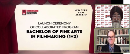ਆਨਲਾਈਨ ਸਮਾਗਮ ਦੌਰਾਨ ਫ਼ਿਲਮ ਮੇਕਿੰਗ ਕੋਰਸ ਦਾ ਉਦਘਾਟਨ ਕਰਦੇ ਚੰਡੀਗੜ੍ਹ ਯੂਨੀਵਰਸਿਟੀ ਦੇ ਪ੍ਰੋ-ਚਾਂਸਲਰ ਡਾ. ਆਰ.ਐਸ ਬਾਵਾ ਅਤੇ ਨਿਊਯਾਰਕ ਫ਼ਿਲਮ ਅਕਾਦਮੀ ਦੇ ਪ੍ਰੈਜੀਡੈਂਟ ਮਾਈਕਲ ਯੰਗ।