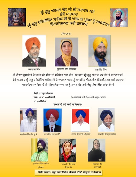 ਇਸ ਸੋਸਾਇਟੀ ਵਲੋਂ, ਦਸ਼ਮੇਸ਼ ਪਿਤਾ ਦੀ ਚਲਾਈ ਹੋਈ, ਕਵੀ ਦਰਬਾਰਾਂ ਦੀ ਪਰੰਪਰਾ ਨੂੰ ਸੁਰਜੀਤ ਰੱਖਣ ਹਿੱਤ- ਹਰ ਮਹੀਨੇ ਇੱਕ ਜਾਂ ਦੋ ਕਵੀ ਦਰਬਾਰ ਕਰਾਉਣ ਕਰਾਉਣ ਦਾ ਫੈਸਲਾ ਲਿਆ ਗਿਆ। ਜਿਸ ਤਹਿਤ, ਪਿਛਲੇ ਦੋ ਮਹੀਨਿਆਂ ਵਿੱਚ ਤਿੰਨ ਸਮਾਗਮ, ਬਹੁਤ ਸਫਲ ਰਹੇ। ਇਸੇ ਲੜੀ ਤਹਿਤ, ਜੂਨ ਦੇ ਅੰਤਲੇ ਵੀਕਐਂਡ, ਦੋ ਰੋਜ਼ਾ ਕਵੀ ਦਰਬਾਰ ਦੇ ਪ੍ਰੋਗਰਾਮ ਉਲੀਕੇ ਗਏ। ਪਹਿਲੇ ਦਿਨ ਜਗਬੀਰ ਸਿੰਘ ਨੇ ਮੰਚ ਸੰਚਾਲਨ ਦੀ ਸੇਵਾ ਨਿਭਾਉਂਦਿਆਂ, ਇੰਡੀਆ ਤੋਂ ਕਵੀ ਦਰਬਾਰ ਦੀ ਸ਼ੁਰੂਆਤ ਕੀਤੀ। ਇਸ ਵਿੱਚ- ਬ੍ਰਿਜਮਿੰਦਰ ਕੌਰ ਜੈਪੁਰ, ਚਾਹਕਪ੍ਰੀਤ ਕੌਰ ਜੈਪੁਰ, ਅਤੇ ਕੈਲਗਰੀ ਦੇ ਕਵੀ ਸਾਹਿਬਾਨ- ਗੁਰਚਰਨ ਸਿੰਘ ਹੇਹਰ, ਸਰੂਪ ਸਿੰਘ ਮੰਡੇਰ, ਬਲਵੀਰ ਸਿੰਘ ਗੋਰਾ, ਜਸਵੀਰ ਸਿੰਘ ਸਹੋਤਾ, ਗੁਰਦੀਸ਼ ਕੌਰ ਗਰੇਵਾਲ ਤੋਂ ਇਲਾਵਾ ਟੋਰੰਟੋ ਤੋਂ- ਪਰਮਜੀਤ ਸਿੰਘ, ਅਨੁਰੀਤ ਕੌਰ, ਅਮਿਤੋਜ਼ ਕੌਰ, ਮਨਰੀਤ ਕੌਰ, ਸਿਮਰਲੀਨ ਕੌਰ, ਪ੍ਰਨੀਤ ਕੌਰ ਨੇ ਹਿੱਸਾ ਲਿਆ।ਸਾਰੇ ਕਵੀ ਸਾਹਿਬਾਨ ਨੇ, ਆਪਣੀਆਂ ਭਾਵਪੂਰਤ ਕਵਿਤਾਵਾਂ ਤੇ ਗੀਤਾਂ ਰਾਹੀਂ, ਗੁਰੂ ਸਾਹਿਬਾਂ ਨੂੰ ਸ਼ਰਧਾ ਦੇ ਫੁੱਲ਼ ਭੇਂਟ ਕੀਤੇ ਜਦ ਕਿ- ਡਾ ਬਲਦੇਵ ਸਿੰਘ (ਐਡਮੰਟਨ) ਨੇ ਪੰਜਵੇਂ ਪਾਤਸ਼ਾਹ ਦੀ ਸ਼ਹਾਦਤ ਤੇ ਲਿਖੀ, ਆਪਣੇ ਪਿਤਾ ਜੀ ਦੀ ਖੂਬਸੂਰਤ ਰਚਨਾ ਸਾਂਝ ਪਾਈ। ਜੈਕਾਰਿਆਂ ਦੀ ਗੂੰਜ ਨਾਲ ਕਵੀਆਂ ਨੂੰ ਦਾਦ ਦਿੱਤੀ ਗਈ। ਖੁਸ਼ੀ ਦੀ ਗੱਲ ਇਹ ਸੀ ਕਿ- ਇਸ ਵਿੱਚ ਨਵੀਂ ਪੀੜ੍ਹੀ ਦੇ ਬੱਚਿਆਂ ਨੇ ਬਹੁਤ ਉਤਸ਼ਾਹ ਨਾਲ ਭਾਗ ਲਿਆ।