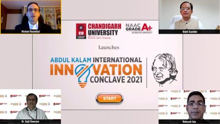 ਫ਼ੋਟੋ ਕੈਪਸ਼ਨ: ਚੰਡੀਗੜ੍ਹ ਯੂਨੀਵਰਸਿਟੀ ਵੱਲੋਂ ਕਰਵਾਈ ਜਾਣ ਵਾਲੀ ਅਬਦੁੱਲ ਕਲਾਮ ਇੰਟਰਨੈਸ਼ਨਲ ਇਨੋਵੇਸ਼ਨ ਕਨਕਲੇਵ-2021 ਦੇ ਉਦਘਾਟਨੀ ਸਮਾਗਮ ਨੂੰ ਸੰਬੋੋਧਨ ਕਰਦੀਆਂ ਸਖ਼ਸ਼ੀਅਤਾਂ।