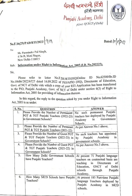 ਦਿੱਲੀ ਦੇ 90 ਫੀਸਦੀ ਸਰਕਾਰੀ ਸਕੂਲਾਂ ਵਿਚ ਪੰਜਾਬੀ ਟੀਚਰ ਨਹੀਂ ਹੋਣ ਦਾ ਆਰ.ਟੀ.ਆਈ. ਰਾਹੀਂ ਹੋਇਆ ਖੁਲਾਸਾ