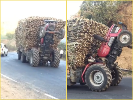 ਟਰਾਲੀ ਵਿੱਚ ਗੰਨੇ ਦੀ ਸਮਰੱਥਾ ਓਵਰਲੋਡ ਹੋਣ ਕਾਰਨ ਉਹ ਟਰੈਕਟਰ ਨੂੰ ਪਿਛਲੇ ਦੋ ਪਹੀਆਂ ਨਾਲ ਚਲਾ ਕੇ ਟਰਾਲੀ ਨੂੰ ਖਿੱਚਣ ਦੀ ਕੋਸ਼ਿਸ਼ ਕਰ ਰਿਹਾ ਹੈ। ਇਸ ਦੌਰਾਨ ਸ਼ੂਟ ਕੀਤਾ ਗਿਆ ਵੀਡੀਓ ਇਨ੍ਹੀਂ ਦਿਨੀਂ ਇੰਟਰਨੈੱਟ ‘ਤੇ ਚਰਚਾ ਦਾ ਵਿਸ਼ਾ ਬਣਿਆ ਹੋਇਆ ਹੈ। ਦਰਅਸਲ, ਟਰੈਕਟਰ ਆਪਣੇ ਪਿਛਲੇ ਪਹੀਆਂ ‘ਤੇ ਪੂਰੀ ਤਰ੍ਹਾਂ ਘੁੰਮ ਰਿਹਾ ਹੈ।