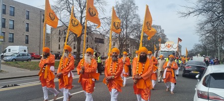 ਗਲਾਸਗੋ, (ਮਨਦੀਪ ਖੁਰਮੀ ਹਿੰਮਤਪੁਰਾ) – ਸਕਾਟਲੈਂਡ ਦੇ ਖੂਬਸੂਰਤ ਸ਼ਹਿਰ ਗਲਾਸਗੋ ਵਿਖੇ ਵਿਸਾਖੀ ਤੇ ਖ਼ਾਲਸਾ ਸਾਜਨਾ ਦੇ ਸੰਬੰਧ ਵਿੱਚ ਵਿਸ਼ਾਲ ਨਗਰ ਕੀਰਤਨ ਕਰਵਾਇਆ ਗਿਆ। ਪੰਜ ਪਿਆਰੇ ਸਾਹਿਬਾਨਾਂ (ਲਭਾਇਆ ਸਿੰਘ ਮਹਿਮੀ, ਬਖਸ਼ੀਸ਼ ਸਿੰਘ ਦੀਹਰੇ, ਜਸਪਾਲ ਸਿੰਘ ਖਹਿਰਾ, ਕਸ਼ਮੀਰ ਸਿੰਘ ਉੱਪਲ, ਅਮਰੀਕ ਸਿੰਘ ਦੀਹਰੇ)ਦੀ ਅਗਵਾਈ ਵਿੱਚ ਸ੍ਰੀ ਗੁਰੂ ਗ੍ਰੰਥ ਸਾਹਿਬ ਜੀ ਦਾ ਸਰੂਪ ਪ੍ਰਕਾਸ਼ਮਾਨ ਕਰਕੇ ਸੁੰਦਰ ਪਾਲਕੀ ਸਾਹਿਬ ਨਾਲ ਨਗਰ ਕੀਰਤਨ ਦੀ ਗੁਰਦੁਆਰਾ ਗ੍ਰੰਥ ਸਾਹਿਬ ਐਲਬਰਟ ਡਰਾਈਵ ਤੋਂ ਸ਼ੁਰੂਆਤ ਹੋਈ। ਬਖਸ਼ੀਸ਼ ਸਿੰਘ ਦੀਹਰੇ ਤੇ ਉਹਨਾਂ ਦੇ ਸਪੁੱਤਰ ਹਰਦੀਪ ਸਿੰਘ ਸੋਢੀ ਦੀ ਅਣਥੱਕ ਮਿਹਨਤ ਨਾਲ ਤਿਆਰ ਪਾਲਕੀ ਸਾਹਿਬ ਵਾਲੇ ਵਾਹਨ ਦੇ ਚਾਲਕ ਵਜੋਂ ਬਾਬਾ ਬੁੱਢਾ ਦਲ ਗਲਾਸਗੋ ਦੇ ਮੁੱਖ ਸੇਵਾਦਾਰ ਹਰਜੀਤ ਸਿੰਘ ਖਹਿਰਾ ਨੇ ਸਾਰਾ ਦਿਨ ਸੇਵਾਵਾਂ ਨਿਭਾਈਆਂ। ਸੰਗਤਾਂ ਵੱਲੋਂ ਸਤਿਨਾਮ ਵਾਹਿਗੁਰੂ ਦਾ ਨਿਰੰਤਰ ਜਾਪ ਕਰਨ ਦੇ ਨਾਲ ਨਾਲ ਸ੍ਰੀ ਗੁਰੂ ਹਰਿਗੋਬਿੰਦ ਸਾਹਿਬ ਗੱਤਕਾ ਅਖਾੜਾ ਦੇ ਵਿਦਿਆਰਥੀ ਗੱਤਕੇ ਦੇ ਜੌਹਰ ਵਿਖਾਉਂਦੇ ਰਹੇ।
