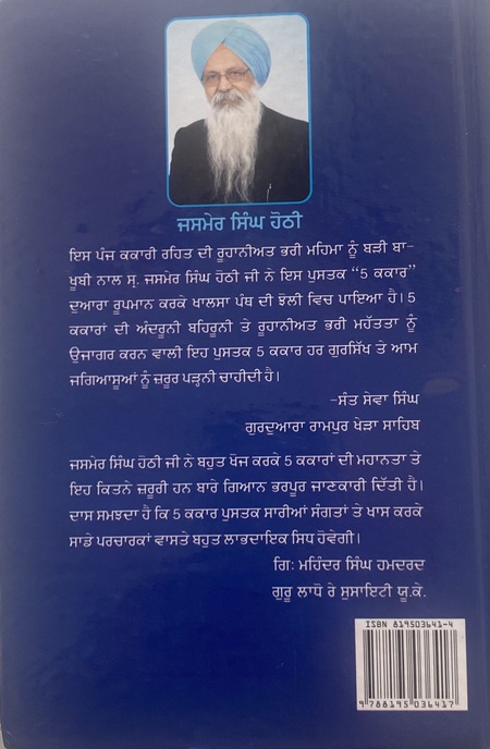 ਅੰਮਿ੍ਰਤਧਾਰੀ ਲਈ ਮਰਿਆਦਾ ਅਨੁਸਾਰ 5 ਕਕਾਰਾਂ ‘ਤੇ ਪਹਿਰਾ ਦੇਣਾ ਲਾਜ਼ਮੀ ਬਣਾਇਆ। ਇਹ 5 ਕਕਾਰ ਵਿਕਾਰਾਂ ਲੋਭ, ਮੋਹ, ਮਾਇਆ, ਹੰਕਾਰ ਆਦਿ ਤੋਂ ਛੁਟਕਾਰਾ ਪਵਾਉਂਦੇ ਹਨ। ਇਨਸਾਨ ਦੀ ਰਹਿਣੀ ਸਰੀਰਕ ਅਤੇ ਮਾਨਸਿਕ ਦੋ ਪ੍ਰਕਾਰ ਦੀ ਹੁੰਦੀ ਹੈ। ਸਰੀਰਕ 5 ਕਕਾਰ ਪਾਉਣ ਅਤੇ ਮਾਨਸਿਕ ਬਾਣੀ ਦਾ ਪਾਠ ਨਿਤਨੇਮ ਅਨੁਸਾਰ ਕਰਨਾ ਹੁੰਦਾ ਹੈ। ਜਸਮੇਰ ਸਿੰਘ ਹੋਠੀ ਇੰਗਲੈਂਡ ਵਿੱਚ ਰਹਿ ਰਿਹਾ ਸਿੱਖ ਪੰਥ ਦਾ ਵਿਦਵਾਨ ਲੇਖਕ ਹੈ। ਉਨ੍ਹਾਂ ਦੀ ਪੰਜਾਬੀ ਵਿੱਚ ਸਿੱਖ ਸਿਧਾਂਤਾਂ ‘ਤੇ ਪਹਿਰਾ ਦੇਣ ਵਾਲੀਆਂ 5 ਪੁਸਤਕਾਂ ਪ੍ਰਕਾਸ਼ਤ ਹੋ ਚੁੱਕੀਆਂ ਹਨ। ਚਰਚਾ ਅਧੀਨ ‘5 ਕਕਾਰ’ ਉਨ੍ਹਾਂ ਦੀ 6ਵੀਂ ਪੁਸਤਕ ਹੈ। ਇਸ ਤੋਂ ਇਲਾਵਾ ਹਿੰਦੀ ਅਤੇ ਅੰਗਰੇਜ਼ੀ ਵਿੱਚ ਵੀ 4 ਪੁਸਤਕਾਂ ਪ੍ਰਕਾਸ਼ਤ ਹੋ ਚੁੱਕੀਆਂ ਹਨ। ਇਸ ਪੁਸਤਕ ਦਾ ਪਹਿਲਾ ਐਡੀਸ਼ਨ ਪੰਜਾਬੀ ਸੱਥ ਵਾਲਸਲ ਇੰਗਲੈਂਡ ਦੇ ਸੰਚਾਲਕ ਮੋਤਾ ਸਿੰਘ ਸਰਾਏ ਅਤੇ ਉਨ੍ਹਾਂ ਦੇ ਸਹਿਯੋਗੀਆਂ ਵੱਲੋਂ ਪ੍ਰਕਾਸ਼ਤ ਕਰਵਾਇਆ ਗਿਆ ਸੀ। ਲੇਖਕ ਨੇ ‘5 ਕਕਾਰਾਂ’ ਦੀ ਮਹੱਤਤਾ ਬਾਰੇ ਵਿਸਤਾਰ ਨਾਲ ਗੁਰਬਾਣੀ ਵਿੱਚੋਂ ਉਦਾਹਰਣਾ ਸਹਿਤ ਜਾਣਕਾਰੀ ਦਿੱਤੀ ਹੈ, ਜਿਹੜੀ ਸਿੱਖ ਸ਼ਰਧਾਲੂਆਂ ਲਈ ਲਾਭਦਾਇਕ ਸਾਬਤ ਹੋਵੇਗੀ। ਜਸਮੇਰ ਸਿੰਘ ਹੋਤੀ ਨੇ ਇਨ੍ਹਾਂ ਕਕਾਰਾਂ ਦੀ ਵਿਗਿਆਨਕ ਮਹੱਤਤਾ ਦਾ ਵੀ ਜ਼ਿਕਰ ਕੀਤਾ ਹੈ।