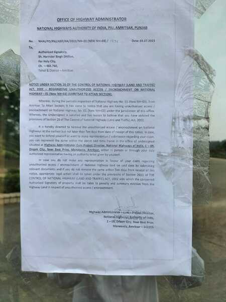 ਅੱਜ ਨੈਸ਼ਨਲ ਹਾਈਵੇ ਅਥਾਰਟੀ ਆਫ ਇੰਡੀਆ ਵਲੋਂ ਕਲੋਨੀ ਦੇ ਮੁੱਖ ਗੇਟ ਉਪਰ ਲਾਏ ਪੁਲ ਦੇ ਗੈਰਕਾਨੂੰਨੀ ਹੋਣ ਦੇ ਨੋਟਿਸ ਕਾਰਨ ਲੋਕਾਂ ਉਪਰ ਖ਼ਤਰੇ ਦੇ ਬੱਦਲ ਮੰਡਰਾਉਣ ਲੱਗੇ ਹਨ।