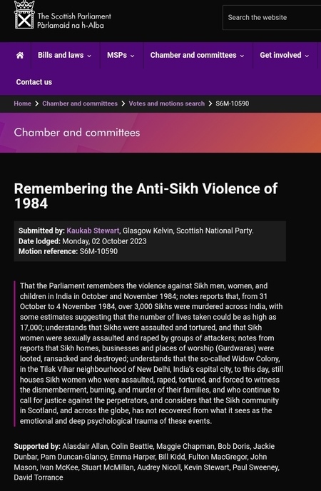 ਰਿਪੋਰਟਾਂ ਦੱਸਦੀਆਂ ਹਨ ਕਿ 31 ਅਕਤੂਬਰ ਤੋਂ 4 ਨਵੰਬਰ 1984 ਤੱਕ, ਪੂਰੇ ਭਾਰਤ ਵਿੱਚ 3,000 ਤੋਂ ਵੱਧ ਸਿੱਖਾਂ ਦਾ ਕਤਲ ਕੀਤਾ ਗਿਆ ਸੀ। ਮੰਨਿਆ ਜਾਂਦਾ ਹੈ ਕਿ ਜਾਨਾਂ ਲੈਣ ਦੀ ਗਿਣਤੀ 17,000 ਤੱਕ ਹੋ ਸਕਦੀ ਹੈ। ਸੰਸਦ ਸਮਝਦਾ ਹੈ ਕਿ ਸਿੱਖਾਂ ‘ਤੇ ਹਮਲਾ ਅਤੇ ਤਸੀਹੇ ਦਿੱਤੇ ਗਏ ਸਨ, ਅਤੇ ਹਮਲਾਵਰਾਂ ਦੇ ਸਮੂਹਾਂ ਦੁਆਰਾ ਸਿੱਖ ਔਰਤਾਂ ਦਾ ਜਿਨਸੀ ਸ਼ੋਸ਼ਣ ਅਤੇ ਬਲਾਤਕਾਰ ਕੀਤਾ ਗਿਆ ਸੀ। ਰਿਪੋਰਟਾਂ ਤੋਂ ਦੱਸਦੀਆਂ ਹਨ ਕਿ ਸਿੱਖ ਘਰਾਂ, ਕਾਰੋਬਾਰਾਂ ਅਤੇ ਧਾਰਮਿਕ ਸਥਾਨਾਂ (ਗੁਰਦੁਆਰਿਆਂ) ਨੂੰ ਲੁੱਟਿਆ ਗਿਆ, ਭੰਨ-ਤੋੜ ਅਤੇ ਤਬਾਹ ਕਰ ਦਿੱਤਾ ਗਿਆ। ਭਾਰਤ ਦੀ ਰਾਜਧਾਨੀ ਨਵੀਂ ਦਿੱਲੀ ਦੇ ਤਿਲਕ ਵਿਹਾਰ ਇਲਾਕੇ ਵਿੱਚ ਅਖੌਤੀ ਵਿਧਵਾ ਕਾਲੋਨੀ ਵਿੱਚ ਅੱਜ ਵੀ ਉਹ ਸਿੱਖ ਔਰਤਾਂ ਵਸਦੀਆਂ ਹਨ ਜਿਨ੍ਹਾਂ ਉੱਤੇ ਹਮਲਾ, ਬਲਾਤਕਾਰ, ਤਸੀਹੇ ਦਿੱਤੇ ਗਏ। ਉਨ੍ਹਾਂ ਦੇ ਪਰਿਵਾਰ ਅਤੇ ਇਨਸਾਫਪਸੰਦ ਲੋਕ ਦੋਸ਼ੀਆਂ ਦੇ ਖਿਲਾਫ ਨਿਆਂ ਦੀ ਮੰਗ ਕਰਦੇ ਰਹਿੰਦੇ ਹਨ, ਅਤੇ ਇਹ ਮੰਨਦੇ ਹਨ ਕਿ ਸਕਾਟਲੈਂਡ ਅਤੇ ਦੁਨੀਆ ਭਰ ਵਿੱਚ ਸਿੱਖ ਭਾਈਚਾਰਾ, ਇਹਨਾਂ ਘਟਨਾਵਾਂ ਦੇ ਭਾਵਨਾਤਮਕ ਅਤੇ ਡੂੰਘੇ ਮਨੋਵਿਗਿਆਨਕ ਸਦਮੇ ਤੋਂ ਉਭਰਿਆ ਨਹੀਂ ਹੈ।”
