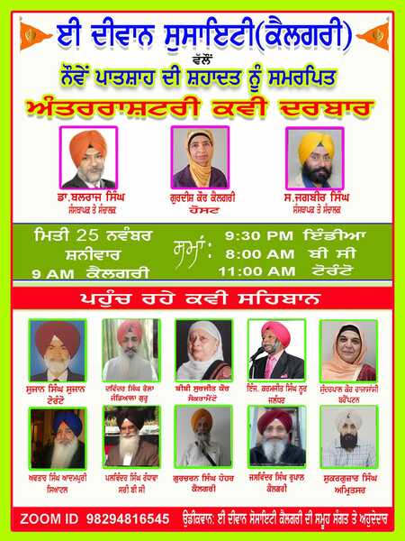ਕੈਲਗਰੀ: ਈ- ਦੀਵਾਨ ਸੋਸਾਇਟੀ ਕੈਲਗਰੀ ਵਲੋਂ, 25 ਨਵੰਬਰ ਦਿਨ ਸ਼ਨਿਚਰਵਾਰ ਨੂੰ, ਆਪਣੇ ਹਫਤਾਵਾਰ ਸਮਾਗਮ ਵਿੱਚ, ਸਾਹਿਬ ਸ੍ਰੀ ਗੁਰੂ ਤੇਗ ਬਹਾਦਰ ਜੀ ਦੇ ਸ਼ਹੀਦੀ ਦਿਹਾੜੇ ਨੂੰ ਸਮਰਪਿਤ, ਔਨਲਾਈਨ ਇੰਟਰਨੈਸ਼ਨਲ ਕਵੀ ਦਰਬਾਰ ਕਰਾਇਆ ਗਿਆ- ਜਿਸ ਵਿੱਚ ਦੇਸ਼ ਵਿਦੇਸ਼ ਤੋਂ ਮਹਾਨ ਪੰਥਕ ਕਵੀਆਂ ਨੇ ਸ਼ਿਰਕਤ ਕੀਤੀ। ਇਹ ਸੰਸਥਾ ਖਾਸ ਦਿਹਾੜਿਆਂ ਤੇ ਕਵੀ ਦਰਬਾਰ ਕਰਾ ਕੇ, ਦਸ਼ਮੇਸ਼ ਪਿਤਾ ਦੀ ਚਲਾਈ ਹੋਈ ਇਸ ਪਰੰਪਰਾ ਨੂੰ ਅੱਗੇ ਤੋਰਨ ਵਿੱਚ ਵਿਸ਼ੇਸ਼ ਯੋਗਦਾਨ ਪਾ ਰਹੀ ਹੈ।