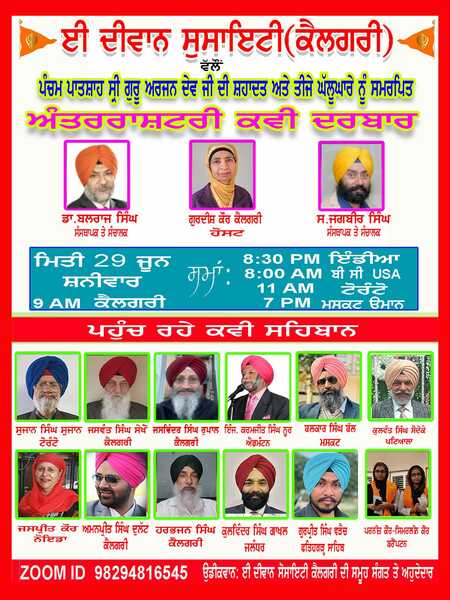 ਕੈਲਗਰੀ : ਈ ਦੀਵਾਨ ਸੋਸਾਇਟੀ, ਕੈਲਗਰੀ ਵੱਲੋਂ ਆਪਣੇ ਹਫਤਾਵਾਰੀ ਪ੍ਰੋਗਰਾਮ ਵਿੱਚ ਗੁਰੂ ਅਰਜਨ ਦੇਵ ਜੀ ਦੀ ਸ਼ਹਾਦਤ ਅਤੇ ਤੀਜੇ ਘੱਲੂਘਾਰੇ ਨੂੰ ਸਮਰਪਿਤ ਅੰਤਰਰਾਸ਼ਟਰੀ ਕਵੀ ਦਰਬਾਰ ਆਯੋਜਿਤ ਕੀਤਾ ਗਿਆ, ਜਿਸ ਵਿੱਚ ਵੱਖ ਵੱਖ ਦੇਸ਼ਾਂ ਤੋਂ ਕਵੀ ਜਨਾਂ ਨੇ ਆਪਣੀਆਂ ਰਚਨਾਵਾਂ ਸਾਂਝੀਆਂ ਕੀਤੀਆਂ। ਇਹ ਸੋਸਾਇਟੀ ਗੁਰੂ ਗੋਬਿੰਦ ਸਿੰਘ ਜੀ ਦੀ ਚਲਾਈ ਕਵੀ – ਦਰਬਾਰ ਸਜਾਉਣ ਦੀ ਪਿਰਤ ਨੂੰ ਜਿੰਦਾ ਰੱਖ ਰਹੀ ਹੈ।